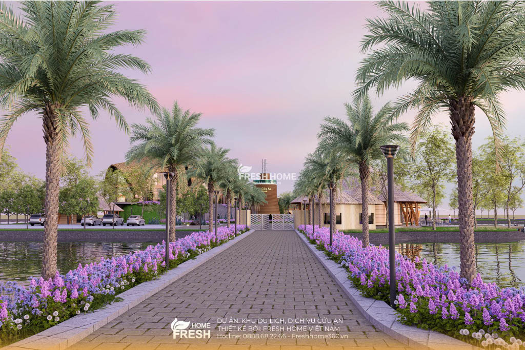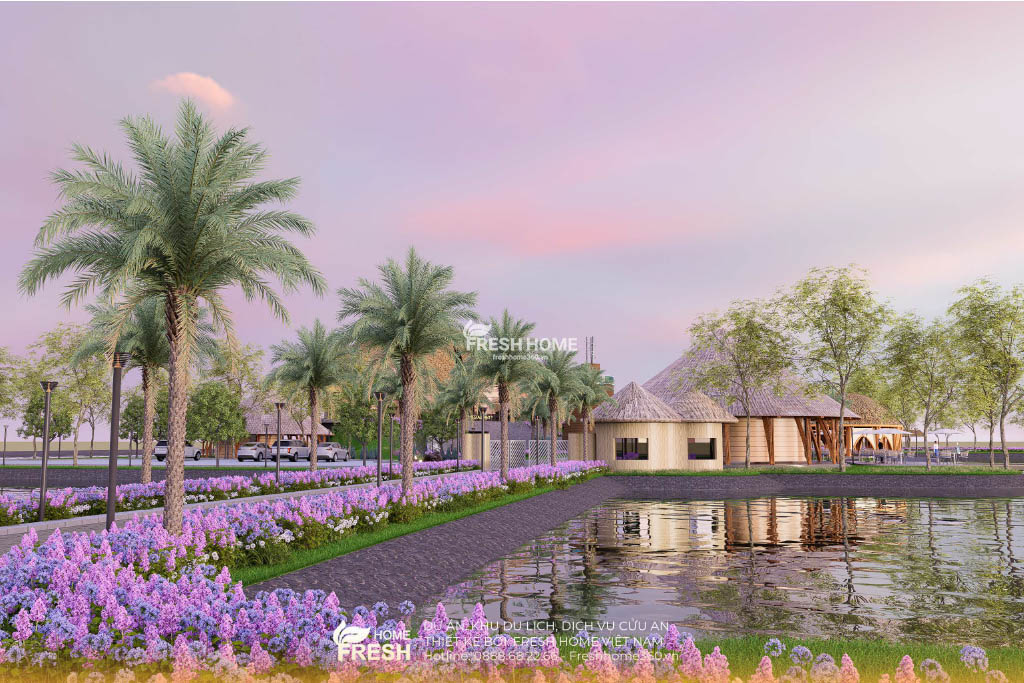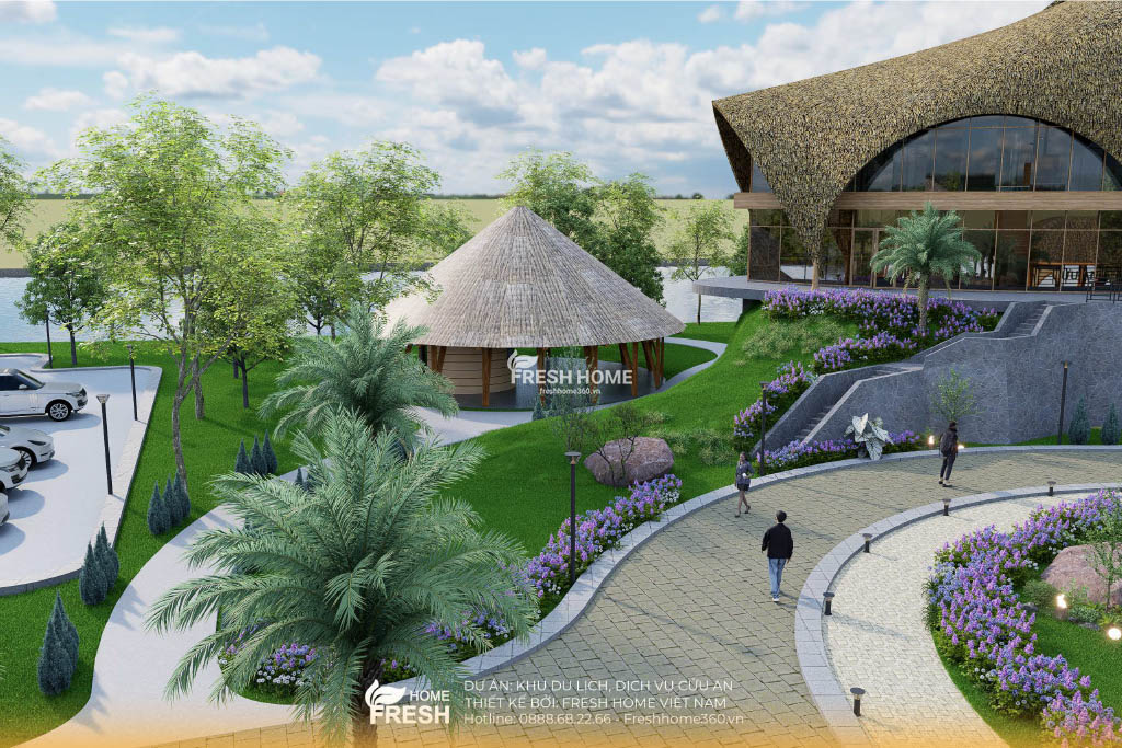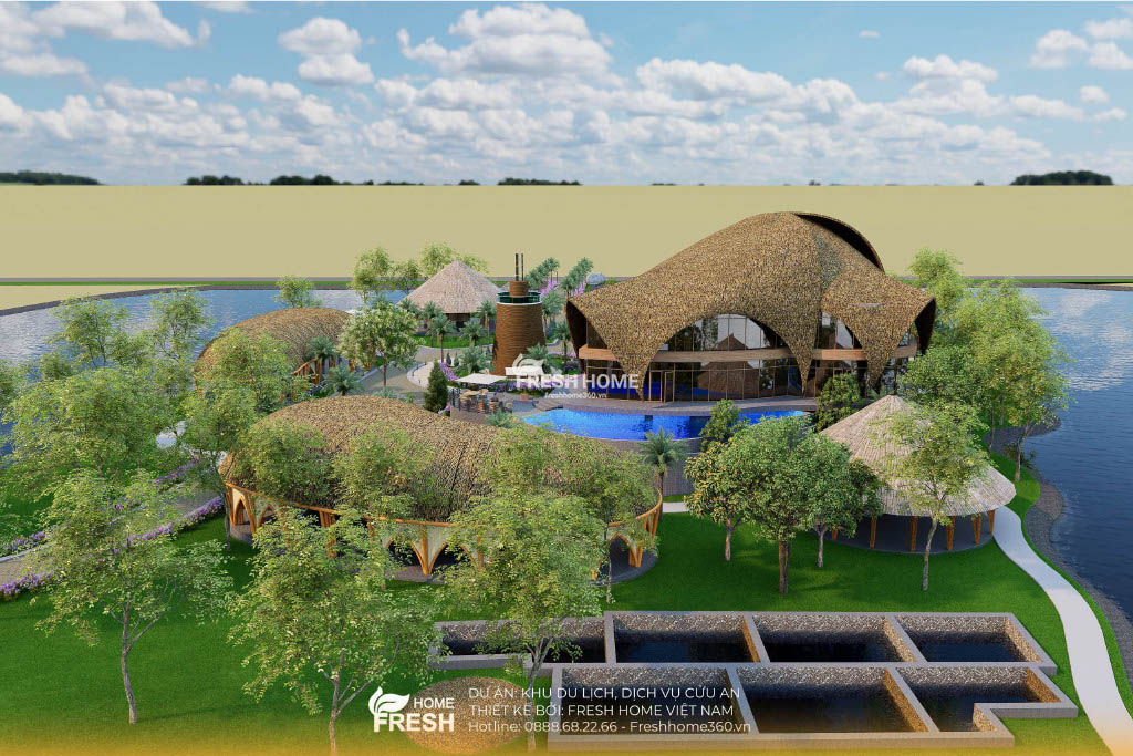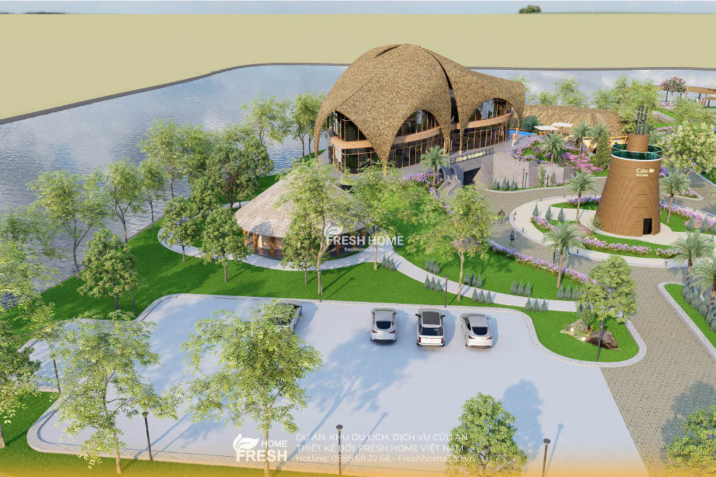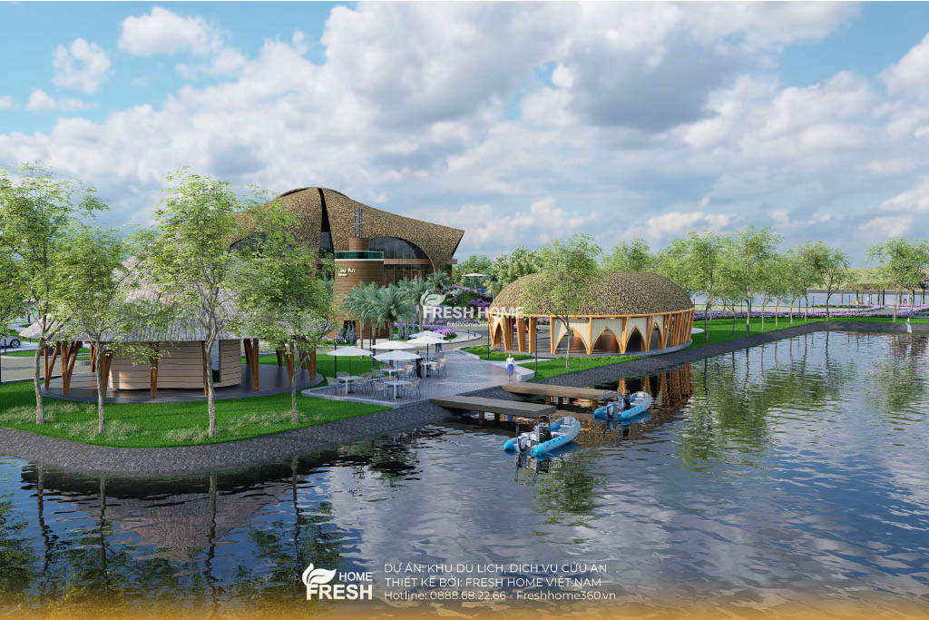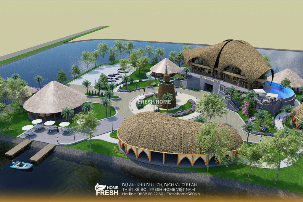 Khu du lịch – nghỉ dưỡng Cửu An được phát triển theo mô hình sinh thái ven hồ, lấy cảm hứng từ vẻ đẹp tự nhiên của miền sông nước. Dựa trên triết lý “gần gũi – hài hoà – bền vững”, toàn bộ kiến trúc trong dự án được FreshHome thiết kế bằng đường cong mềm mại, mái lá, tạo nên cảm giác bình yên và thân thiện với du khách.